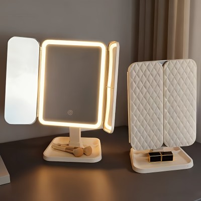 LED Makeup Mirror with 270° Rotation, Tri-Fold Design and Rechargeable Battery - Smart Touch Control, 3-Color Dimming Desktop Van
